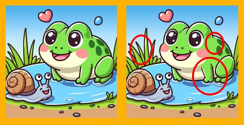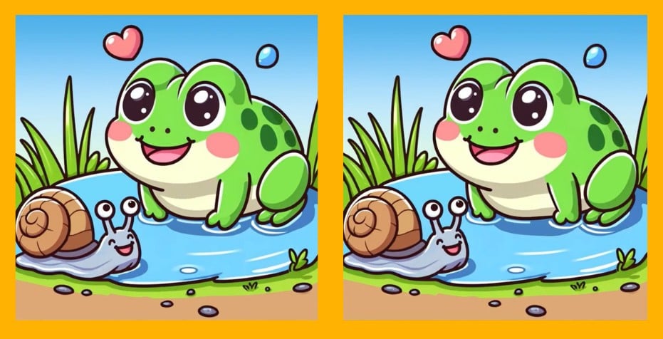 Ben je klaar voor de volgende uitdaging? Kijk eens goed naar twee afbeeldingen van een kikker en een slak. Op het eerste gezicht zien ze er misschien hetzelfde uit, maar er zijn 3 kleine verschillen. Denk je dat je ze allemaal kunt vinden in 17 seconden? Probeer het en test je gezichtsvermogen!