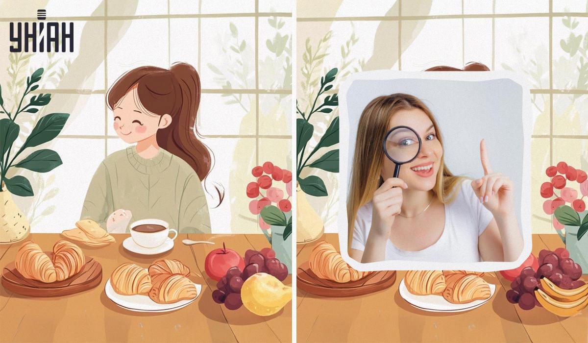 Op de foto’s zie je een schattig meisje in haar keuken ontbijten. Ze drinkt koffie (of thee) met heerlijke croissants. En als toetje wordt ze verwacht met fruiti. De afbeeldingen zien er bijna identiek uit, met vier subtiele verschillen. Kun jij ze vinden?
