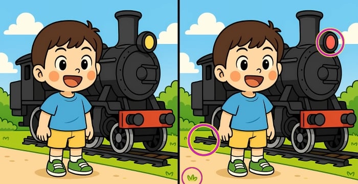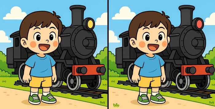 Ben je klaar voor de volgende uitdaging? Kijk eens goed naar de twee afbeeldingen van de jongen die naast de stoomtrein staat. Op het eerste gezicht lijken ze identiek, maar er zijn 3 kleine verschillen. Denk je dat je ze allemaal kunt vinden in 29 seconden? Probeer het en test je visuele scherpte!
